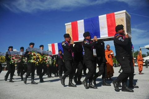 | Funérailles de six soldats thaïlandais tués lors d'un attentat à la bombe dans le sud du pays en avril. |