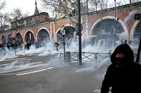 | Des manifestants dans des nuages de gaz lacrymogène lors de la manifestation parisienne contre la réforme des retraites, le 11 janvier. |