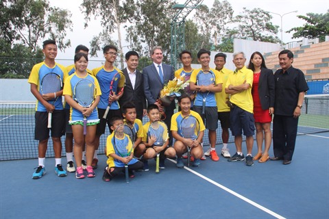 | Le président de l’ITF et les jeunes joueurs du Centre de tennis Phu Tho. |