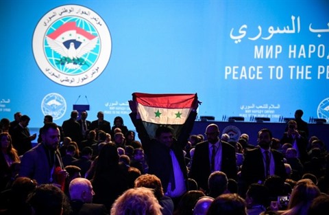 | Un homme brandit un drapeau syrien lors du Congrès du dialogue national syrien le 30 janvier, à Sotchi. |