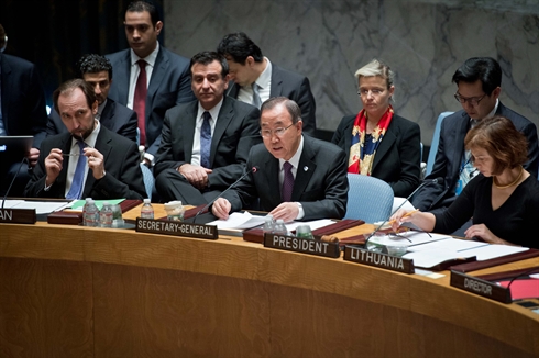 | Le secrétaire général de l'ONU, Ban Ki-moon (1er rang, centre), lors d'une réunion du Conseil de sécurité, le 22 février à New York. |