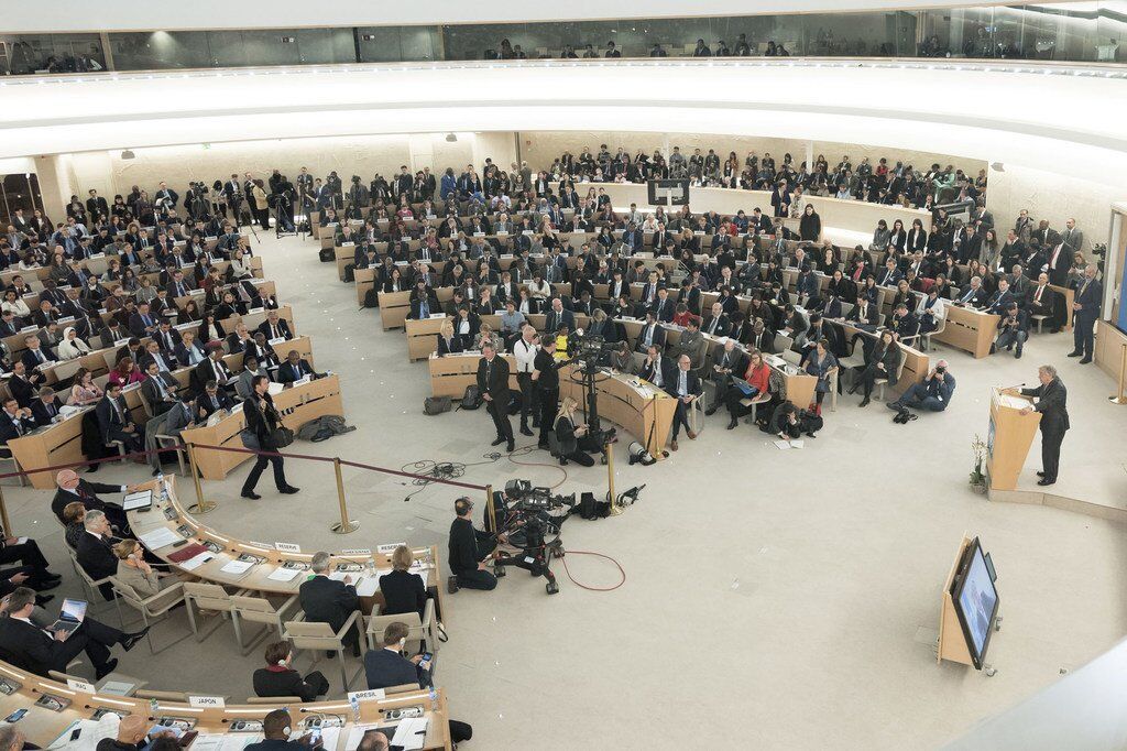 | Le secrétaire général de l'ONU, António Guterres, à la 37e session du Conseil des droits de l'homme, le 26 février 2018. |
