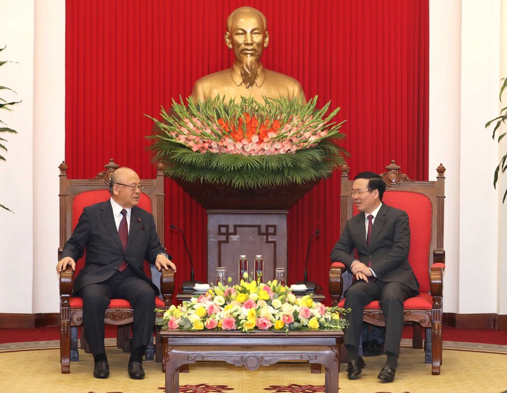 | Vo Van Thuong (droite), membre du Bureau politique, permanent du Secrétariat du Parti communiste du Vietnam, et Tsutomu Takebe, conseiller spécial de l’Alliance des députés d’amitié Japon - Vietnam. |