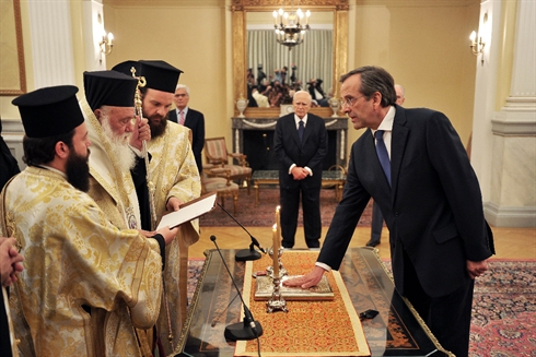 | Prestation de serment du nouveau Premier ministre Antonis Samaras (droite), le 20 juin au Palais présidentiel à Athènes. |