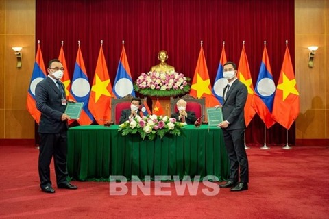 Le secrétaire général du Comité central du Parti communiste du Vietnam Nguyên Phu Trong et le secrétaire général du Comité central du Parti révolutionnaire populaire lao et président du Laos Thongloun Sisoulith en visite officielle au Vietnam, ont assisté à la signature du document.