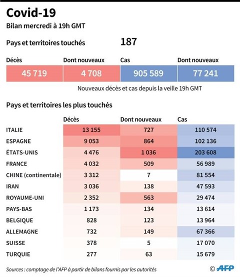 Plus de 900.000 cas de COVID-19 ont été recensés, dont 215.000 aux États-Unis où la maladie progresse le plus vite. Faute de capacité suffisante de dépistage, ces bilans sont très probablement bien en-dessous de la réalité.
