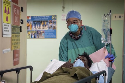 | Transporter un patient atteint du COVID-19 au navire-hôpital USNS Mercy à Los Angeles, le 21 avril. |
