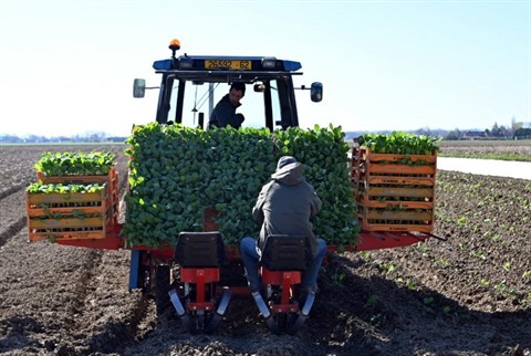 | Récolte de choux-fleurs près de Béthune, dans le Nord de la France, le 24 mars. |