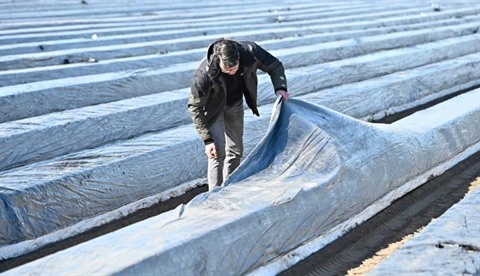 | Thomas Syring, un agriculteur allemand, dans ses champs d'asperges à Beelitz, à l'Est de Berlin, le 23 mars. |