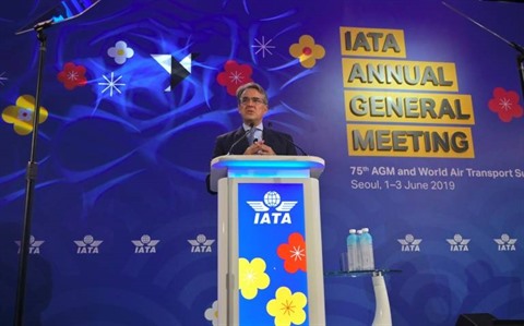| Le directeur général de l'IATA, Alexandre de Juniac, lors de la réunion annuelle de l'IATA à Seoul le 2 juin 2019 |