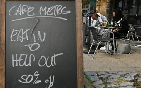 | Des clients d'un restaurant devant une pancarte promouvant le coup de pouce du gouvernement aux restaurateurs, à Manchester, le 3 août. |