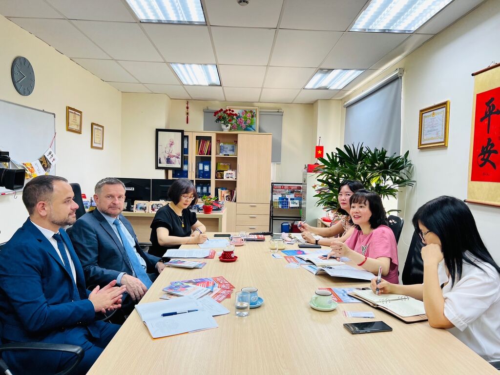 | Le Représentant régional pour l'Asie et le Pacifique de l'OIF, Edgar Doerig (2e à gauche), et la Rédactrice en chef du Courrier du Vietnam, Nguyên Hông Nga (2e à droite), le 17 mai à Hanoï. |