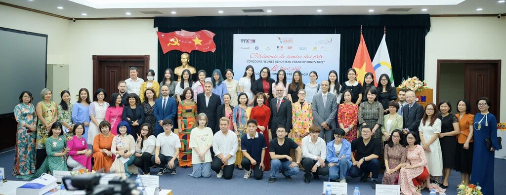 | Journalistes du Courrier du Vietnam et invités à la cérémonie de remise des prix du concours d'écriture "Jeunes Reporters Francophones 2022". |