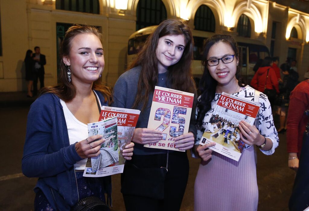 | Une journaliste du Courrier du Vietnam (droite) et deux lectrices étrangères du journal lors d'un événement francophone à Hanoï. |