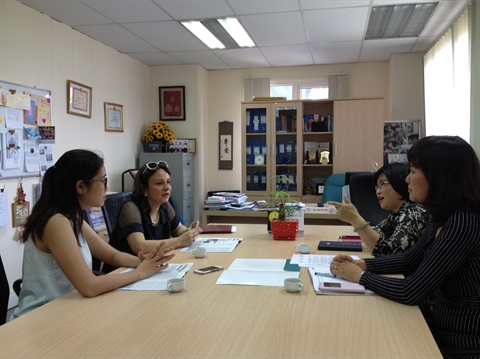 | Séance de travail entre Sophie Goedefroit, directrice du Bureau Asie-Pacifique de l’Agence universitaire de la Francophonie (2e à gauche) et la direction du Courrier du Vietnam, le 15 avril à Hanoi. |
