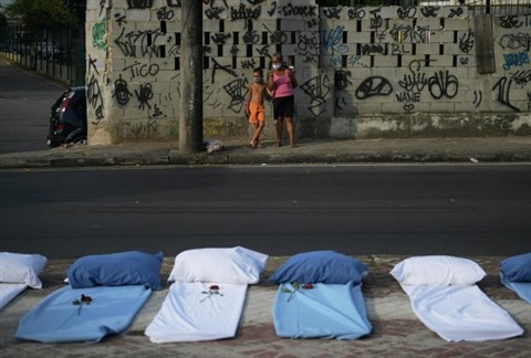 | Une femme et un jeune garçon devant des matelas symbolisant les morts du COVID-19, lors d'une manifestation contre la flambée de l'épidémie, à Rio de Janeiro (Brésil), le 24 mars. |