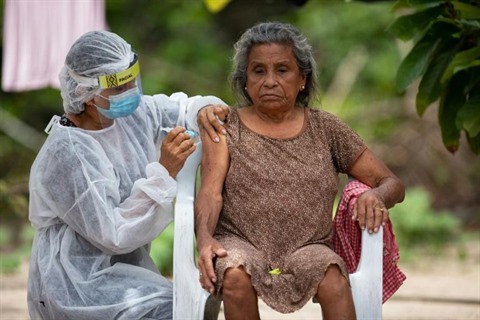 | Une femme de 76 ans, Rosina Ruiz Carvalho, est vaccinée dans le village de Nossa Senhora Livramento, près de Manaus (Brésil), le 9 février. |