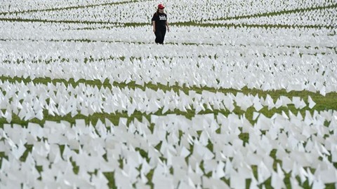| Quelque 600.000 petits drapeaux blancs symbolisant les morts américains du COVID-19 ont été installés en bas du Washington Monument dans la capitale fédérale. |