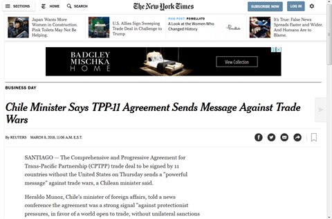 Onze pays - dont les principaux alliés des États-Unis comme le Japon, le Canada et l’Australie - a signé jeudi 8 mars un accord commercial dans la capitale chilienne Santiago, qui remet en cause le point de vue du président Donald Trump sur le commerce en tant que jeu à somme nulle rempli de gagnants et de perdants.