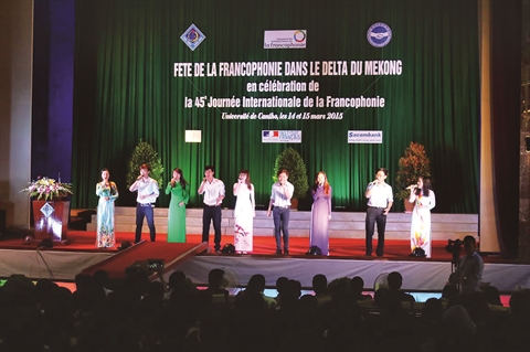 | Un numéro artistique lors de la Fête de la Francophonie organisée à l’Université de Cân Tho (delta du Mékong) en mars 2015. |