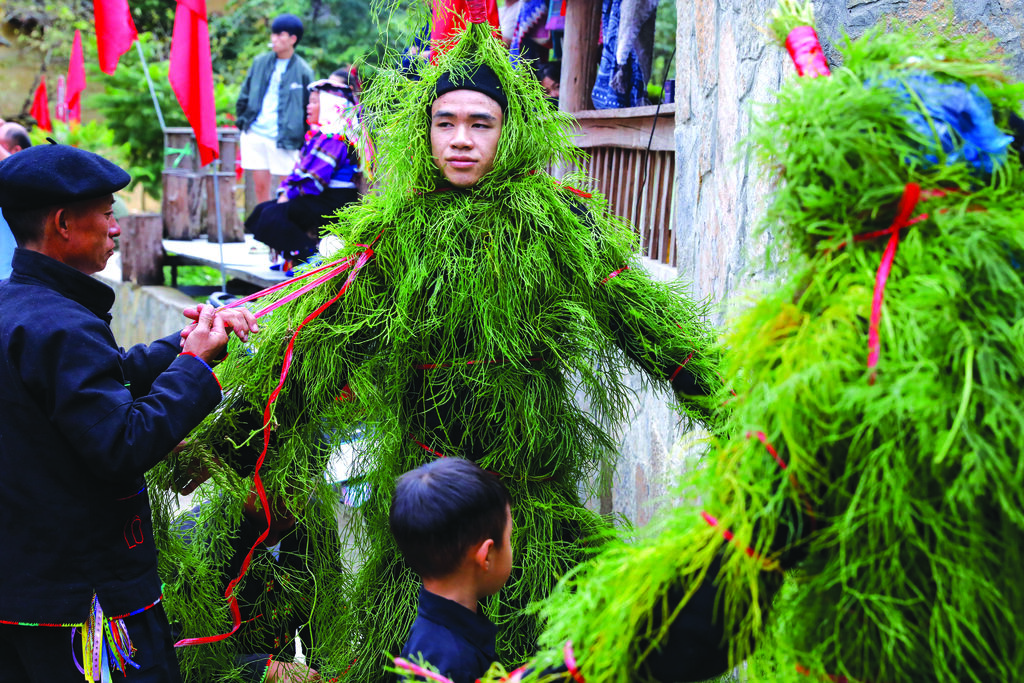 | De jeunes hommes vigoureux portent des vêtements tissés en herbe - symbole rappelant les premières étapes de l’installation du village. |