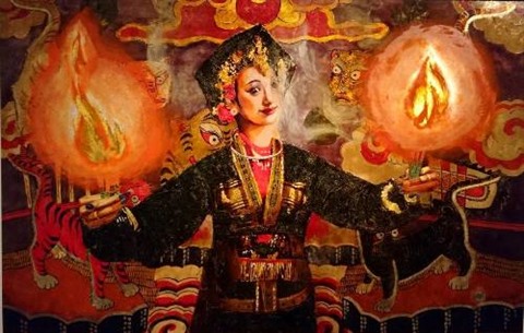 L’image du feu mystérieux et les couleurs vives plongent les spectateurs dans un espace où la frontière entre hommes et divinités est abolie.