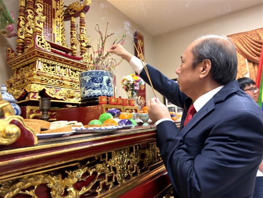 | L'ambassadeur du Vietnam aux États-Unis, Nguyên Quôc Dung, brûle de l'encens à l’occasion de Fête ancestrale de commémoration des rois Hùng, le 25 avril à Washington D.C. |