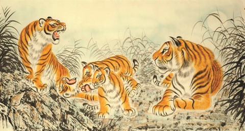 Dans le folklore vietnamien, le tigre représente la force. Le félin est attaché aux divinités, avec le pouvoir sacré de détruire les démons. Donc, les arts picturaux vietnamiens accordent une place importante au félin, souvent à titre de symbole, à l’image des peintures de culte dans les temples, les sanctuaires, les maisons communes.