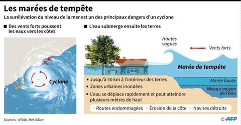 | Explications du phénomène des marées de tempête qui surélève le niveau de la mer lors d'un passage d'un cyclone. |