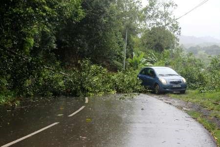 | Une voiture contourne un arbre renversé par le cyclone Belna à Mayotte, le 8 décembre. |