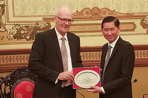 | Le vice-président du Comité populaire de Hô Chi Minh-Ville, Trân Vinh Tuyên (droite), reçoit lecrétaire d'État et vice-ministre des Transports, de l'Approvisionnement énergétique et du Climat du Danemark, Thomas Egebole. |