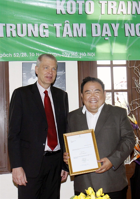 | L'ambassadeur du Danemark au Vietnam, John Nielsen (gauche), a remis le 14 mars à Hanoi la lettre de financement du Fonds royal du Danemark au représentant du Centre d'enseignement professionnel KOTO. |