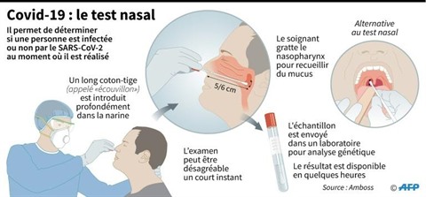 | Schéma sur la technique du test nasal pour les personnes suspectées d'être infectées par le coronavirus. |