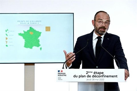 | Le Premier ministre Edouard Philippe détaille la deuxième étape du déconfinement, le 28 mai à Paris. |