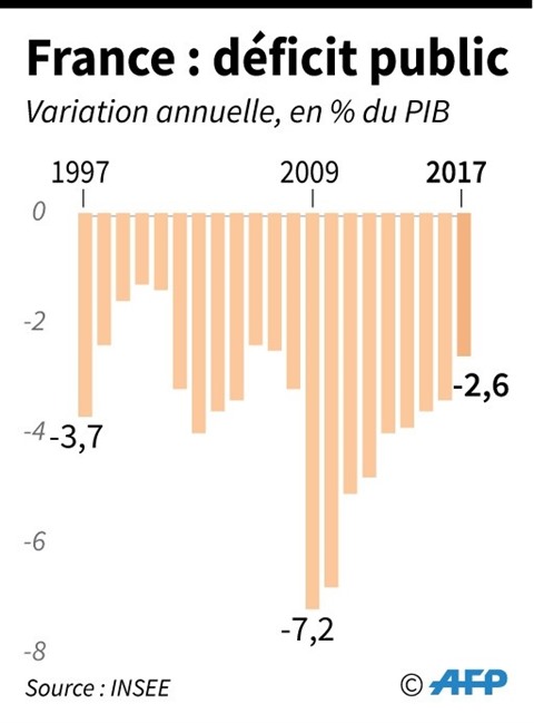 Selon l’Institut français des statistiques (Insee), le déficit cumulé de l’État, des collectivités locales et de la Sécurité sociale a reculé en 2017 de 0,8 point par rapport à 2016, passant de 3,4% à 2,6% du PIB.