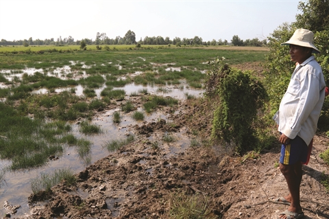 | Le paysan Danh Coi, (domicilié dans la commune de Binh Son, district de Hon Dât, province de Kiên Giang) et sa rizière victime de la salinisation des sols. |