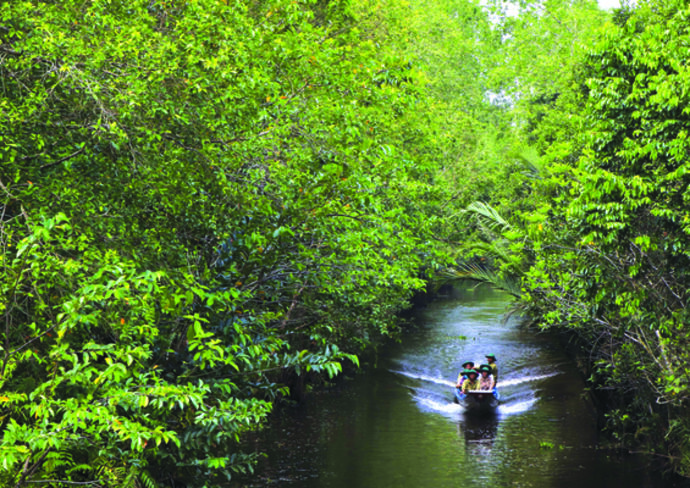 | Les visiteurs apprécient les balades en pirogue à travers la forêt, au sein d’un site de tourisme écologique dans la région de la forêt d’U Minh Hạ. |