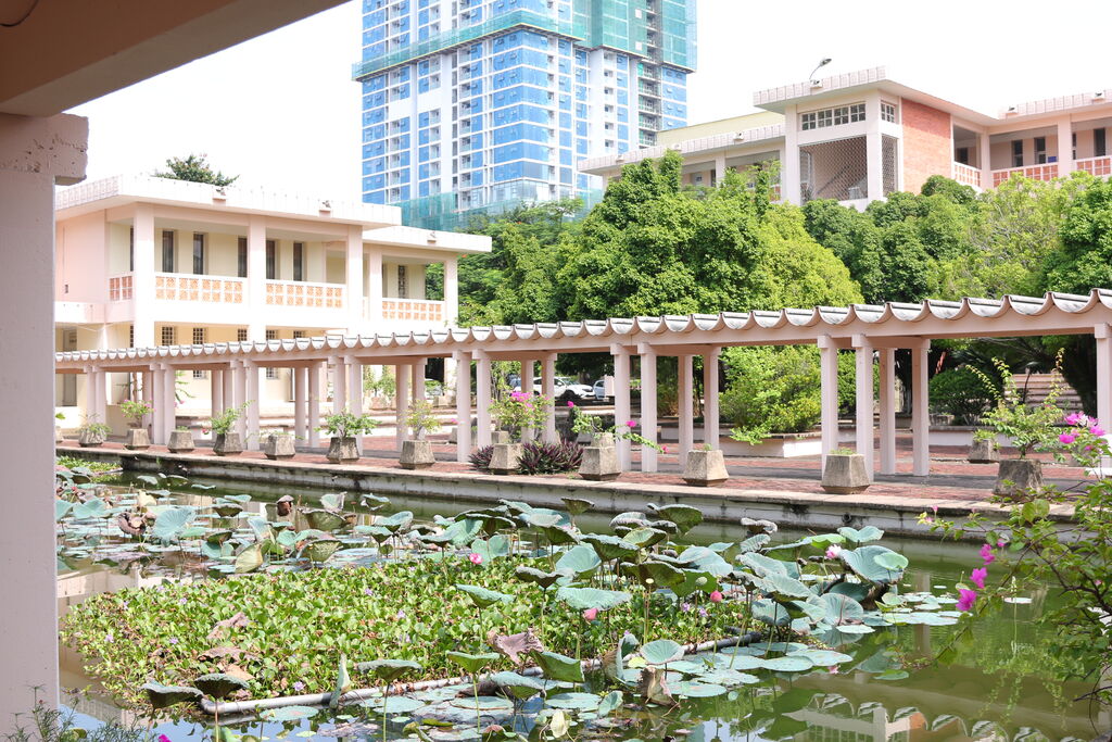 Sur le plan architectural, il est un complexe de nombreuses petites œuvres. En termes de nature et d’ampleur, il n’y a pas d’œuvre plus remarquable. Le bloc le plus élevé est de 4 étages (salles de classe), le bloc le plus bas est d’un étage (bâtiment administratif, auditorium). Le tout est unifié, se soutenant et se complétant. L’ouvrage exploite au maximum la lumière naturelle et s’adapte au climat tropical chaud et humide du Vietnam. La disposition du campus avec de nombreux blocs entrecoupés d’arbres et de lacs crée un espace aéré et frais. Les bâtiments fonctionnels tels que l’auditorium, les bâtiments administratifs et les salles de classes sont conçus de manière scientifique et raisonnable et reliés par de longues passerelles couvertes, formant un système de liaison unique, aidant les gens à se déplacer de manière pratique par tous les temps.