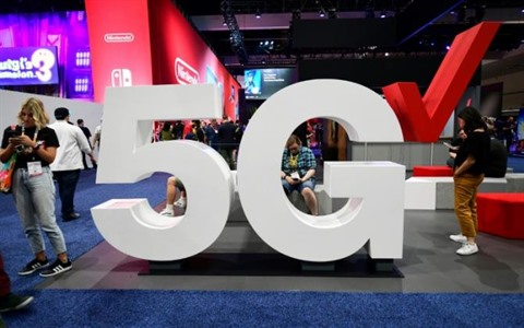 | Sur un stand de Verizon faisant la promotion de la 5G au Salon du jeu vidéo de Los Angeles (E3), le 12 juin 2019. |