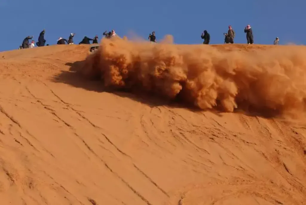 L'ambiance est électrique : les moteurs rugissent au milieu de cette mer de dunes, les spectateurs acclament les pilotes, et d'immenses nuages ocres s'élèvent à chaque soudaine accélération.
