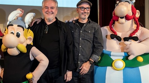| Le dessinateur Didier Conrad et le scénariste Jean-Yves Ferri, avec Astérix et Obélix, le 9 octobre 2017, à Paris. |