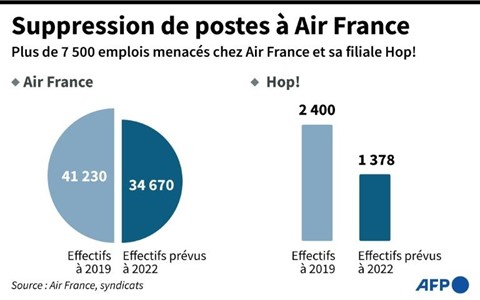 Le groupe a officialisé début juillet la suppression de 7.580 postes d'ici fin 2022, soit 16% des effectifs d'Air France et 42% de ceux de Hop!. La direction compte sur des départs naturels non remplacés et des départs volontaires mais dans le court-courrier, des départs contraints ne sont pas exclus.