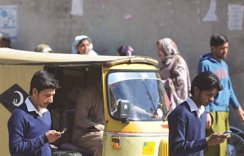 | Des étudiants pakistanais parcourent leurs smartphones dans une rue de Rawalpindi à Islamabad. |