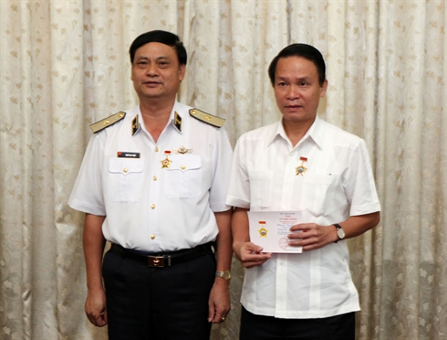 | Le directeur général de la VNA, Nguyên Duc Loi (droite), a reçu du commandement des forces maritimes l’insigne « Pour l’œuvre de défense de la souveraineté maritime». |