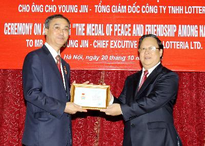 | Le président de l'Union des organisations d'amitié du Vietnam, Vu Xuân Hông (droite), remet l'insigne ''Pour la paix et l'amitié entre les nations'' à Cho Young Jine, le 20 octobre à Hanoi. |