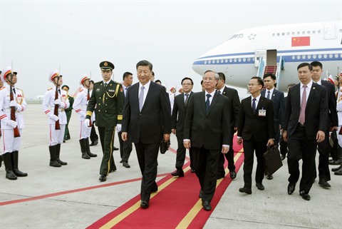 | Le secrétaire général du Parti communiste chinois et président chinois, Xi Jinping (centre), à l'aéroport international de Nôi Bài. |