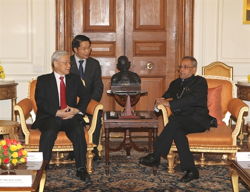 | Le secrétaire général du Parti communiste du Vietnam (PCV), Nguyên Phu Trong (gauche), et le président indien Pranab Mukherjee. |