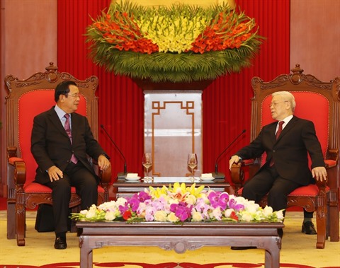 | Le dirigeant Nguyên Phu Trong (droite) et le Premier ministre cambodgien Hun Sen. |
