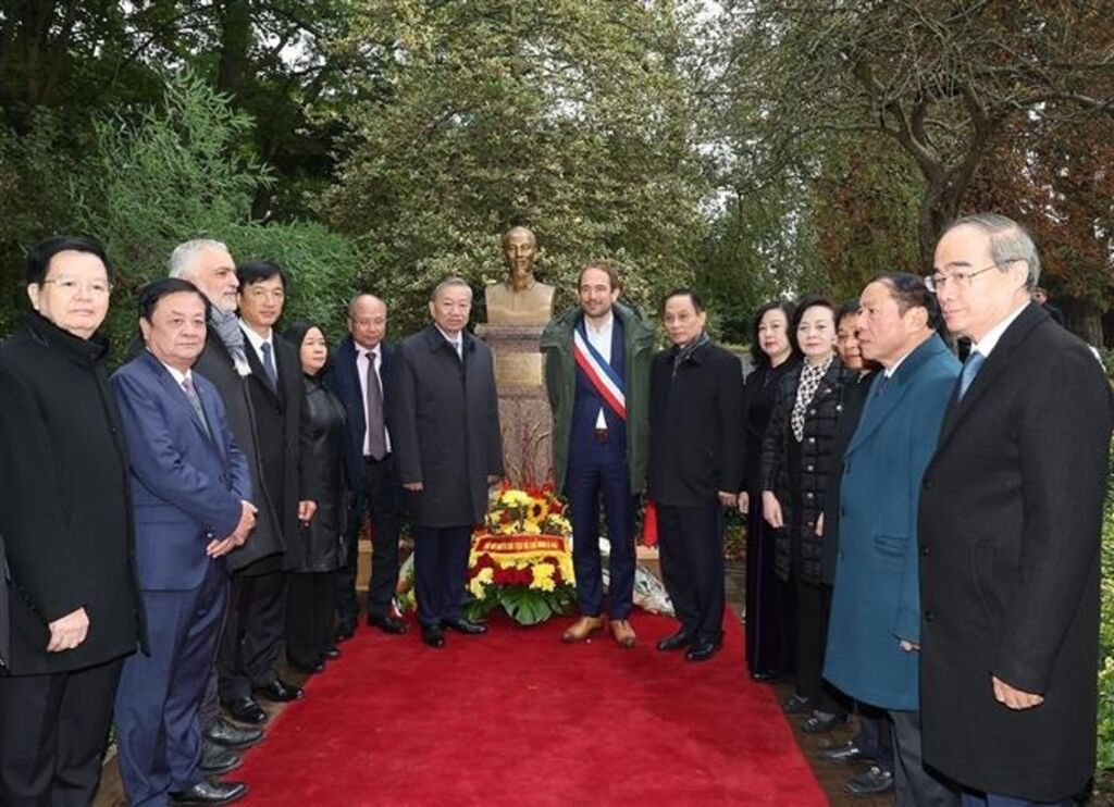 | Le dirigeant vietnamien Tô Lâm (au centre, à gauche), le maire de la ville de Montreuil, Patrice Bessac (au centre, à droite) et des délégués posent devant le buste du Président Hô Chi Minh au parc Montreau à Montreuil, en France. |