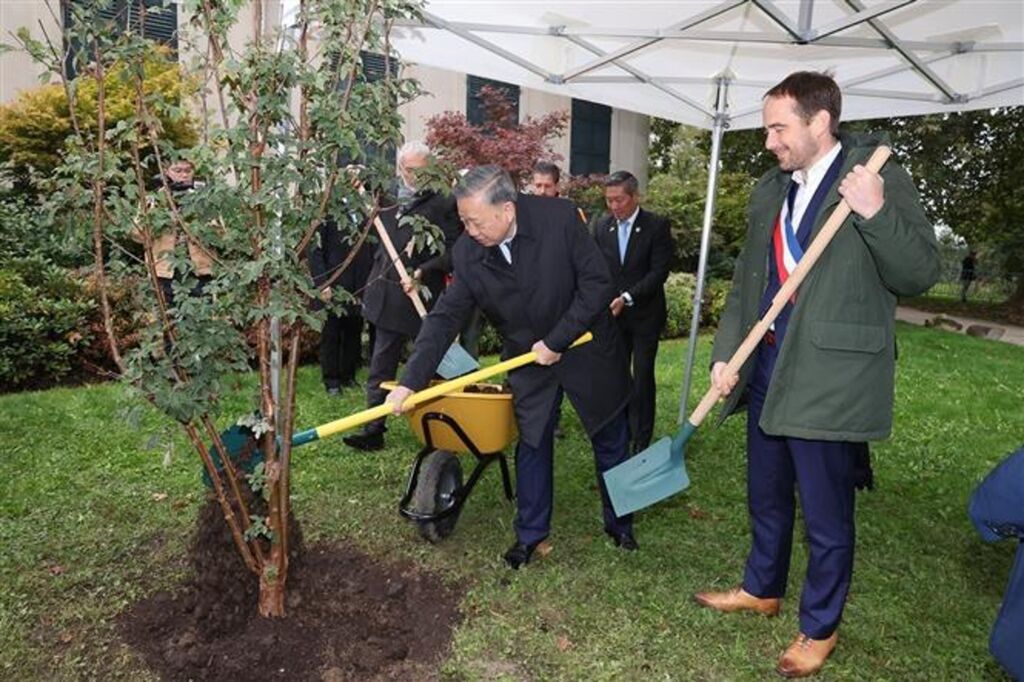| Le secrétaire général du Parti communiste du Vietnam (PCV) et président vietnamien Tô Lâm (gauche) plante un arbre dans le parc Montreau. |